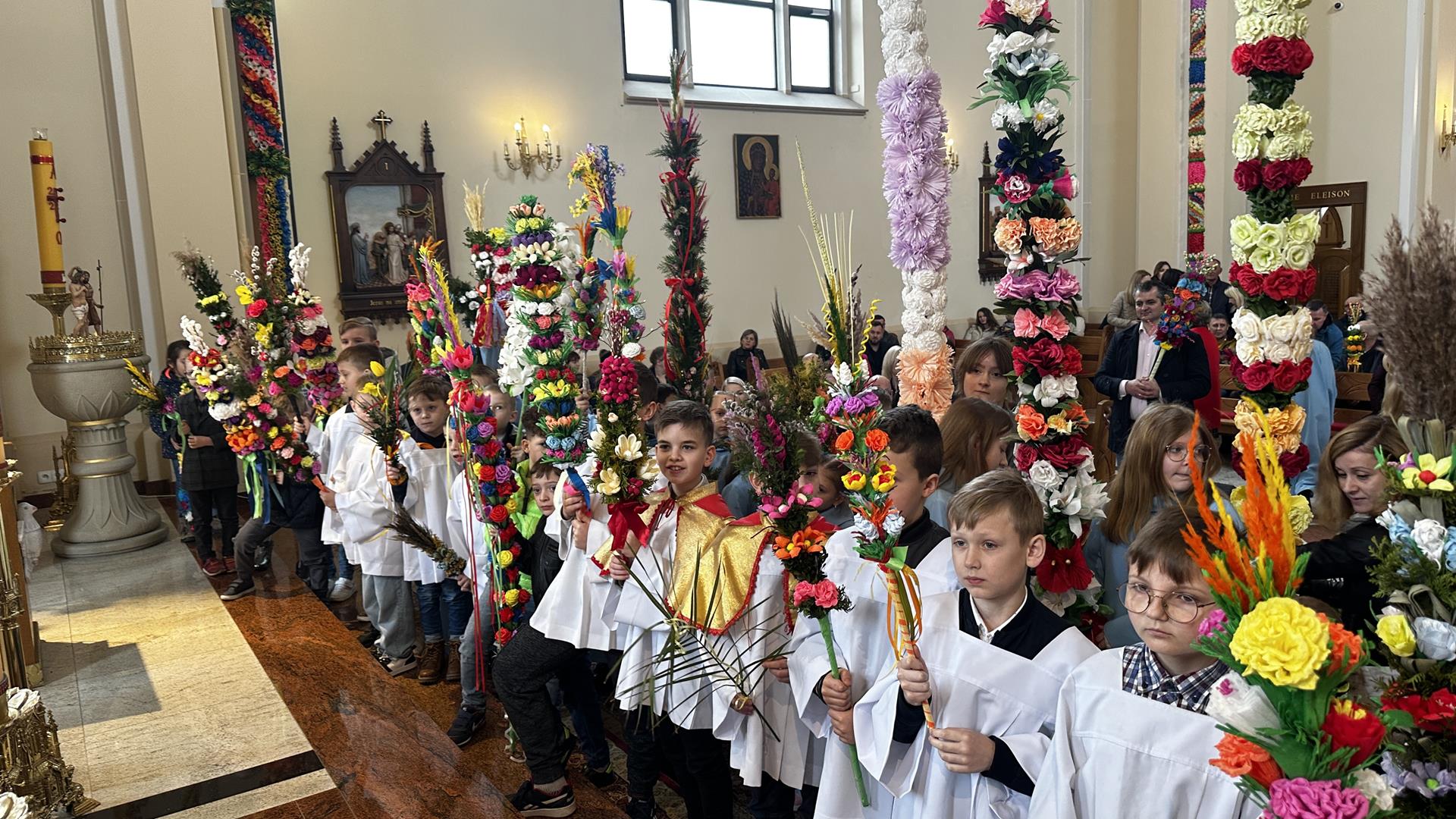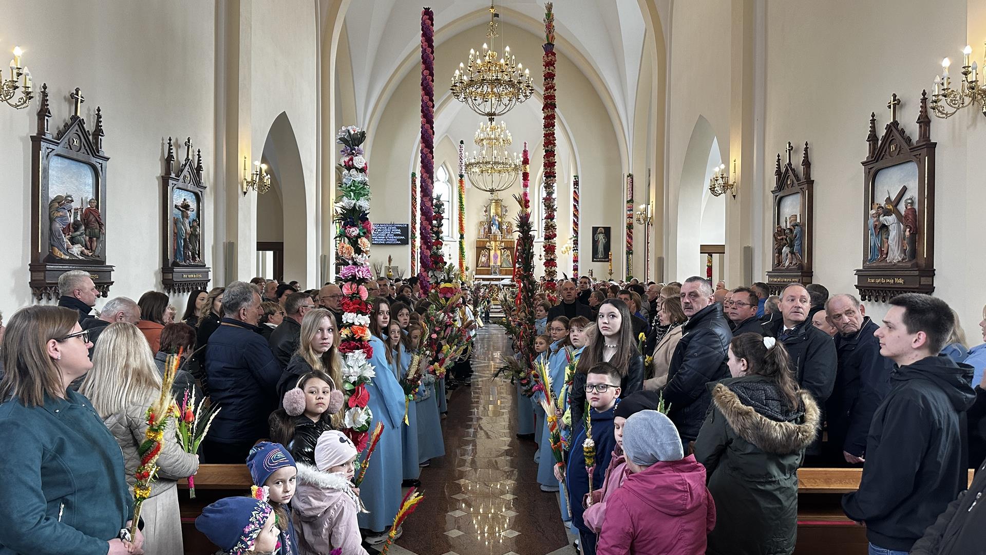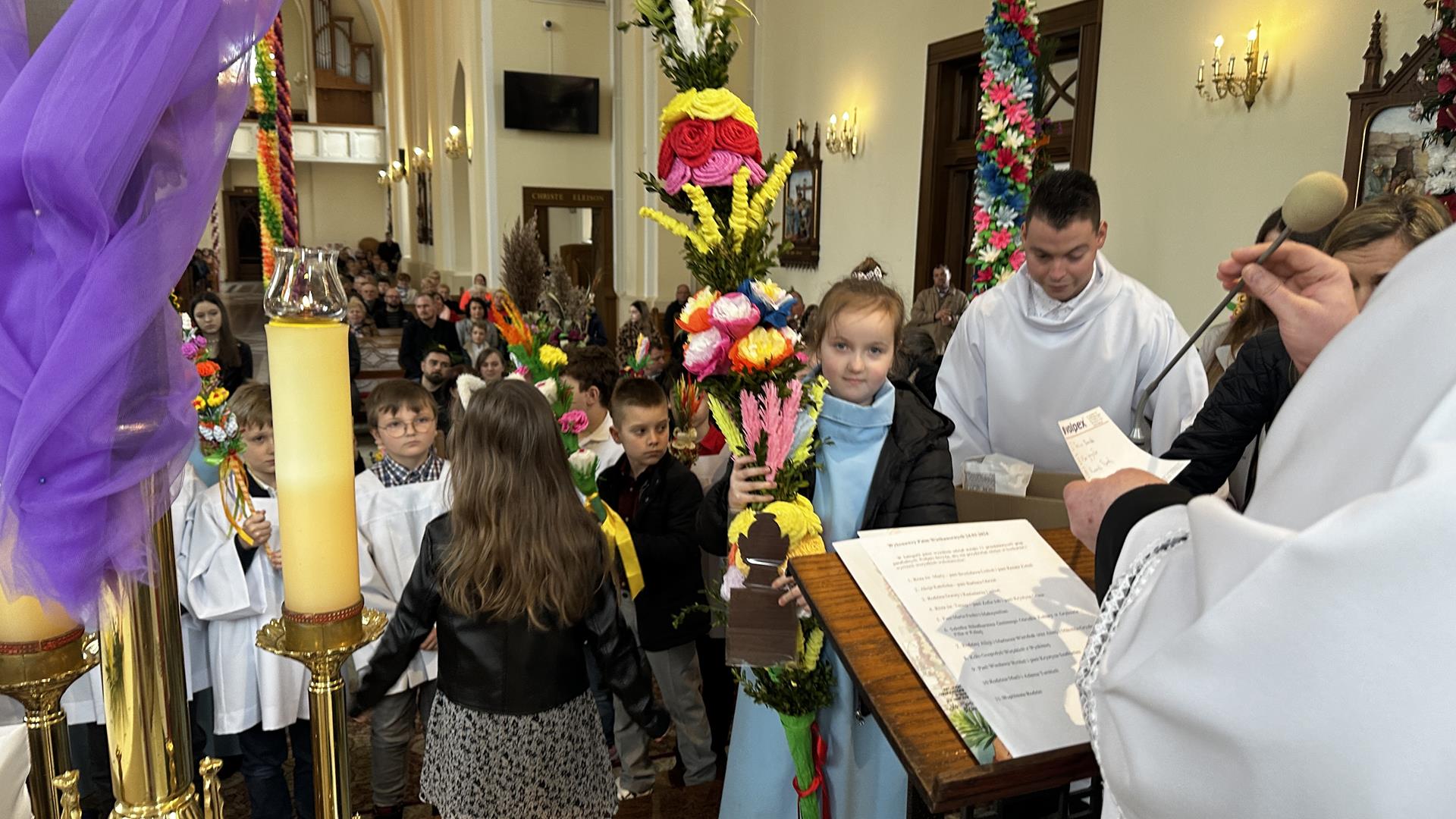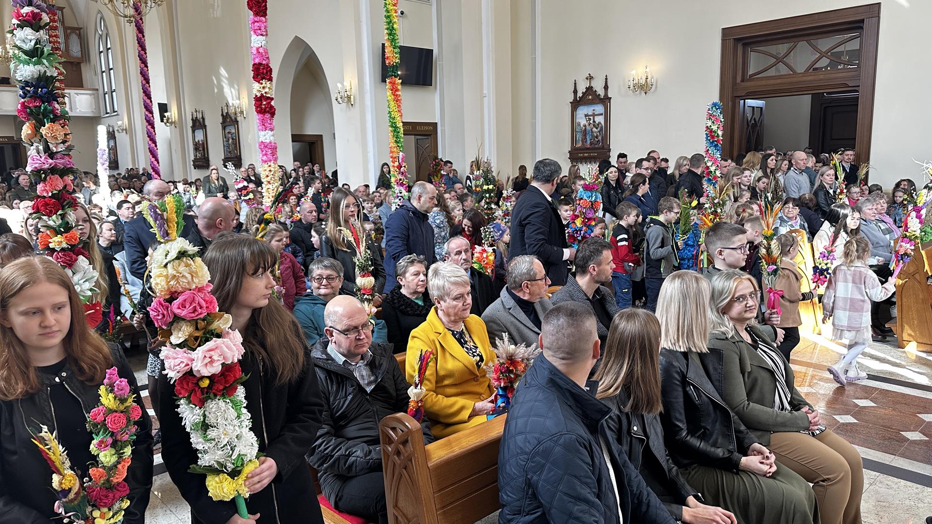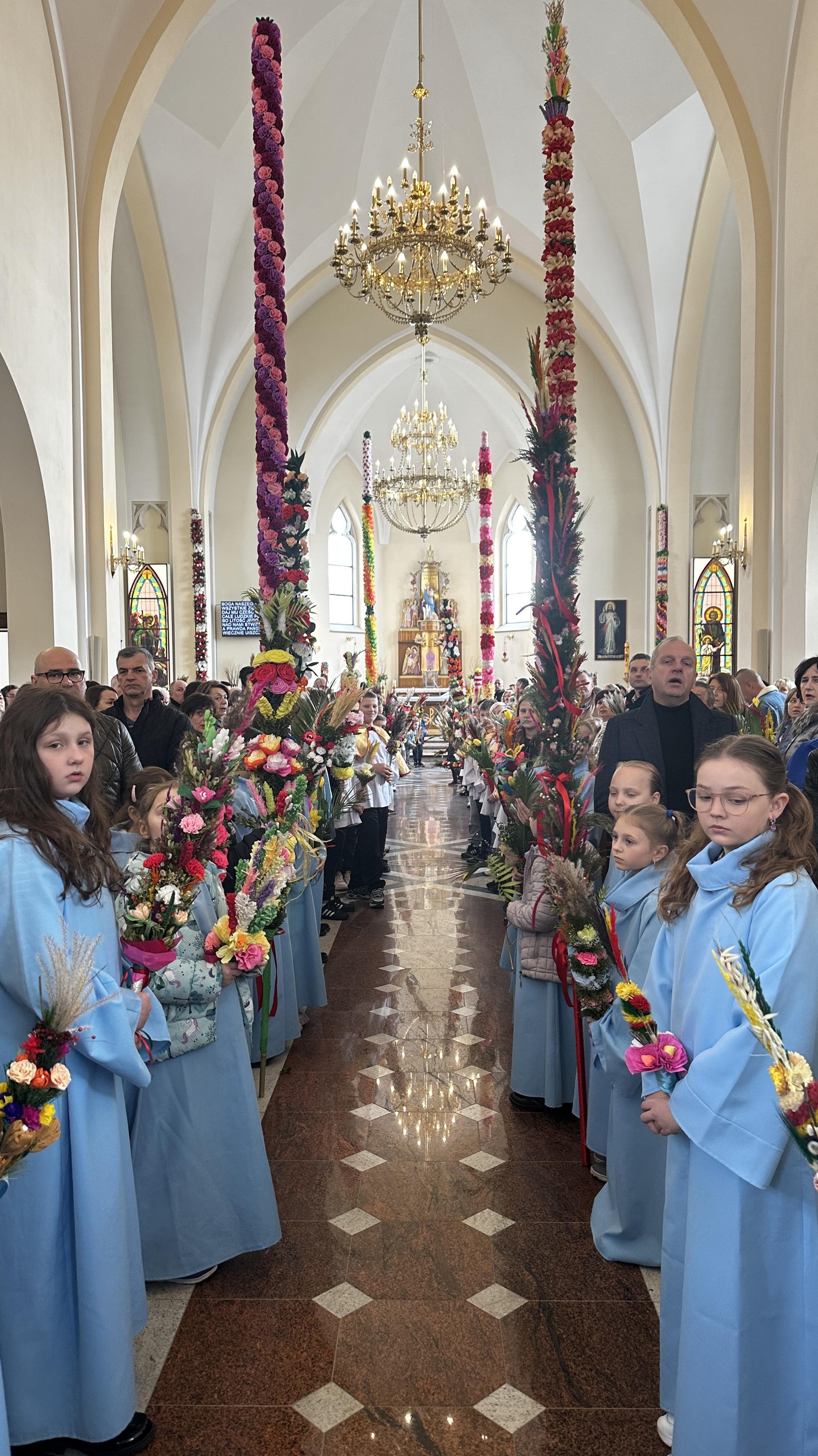 Niedziela Palmowa rozpoczyna w Kościele Wielki Tydzień. W czasie Mszy Świętej o godzinie 9:00 miał miejsce obrzęd poświęcenia palm. Po Eucharystii odbył się konkurs palm niskich do 3 metrów zorganizowany przez Akcję Katolicką. Pierwsze miejsce zajął Tymon Matuła, drugie miejsce zajęła Karolina Iwańska, a trzecie Nikodem Potok i Martyna Potok. Pierwsze cztery wyróżnienia otrzymali: Zofia Broda, Aleksandra Gryzło, Kamil Turek i Gabriela Zięba. W tym roku również jedenastu przedstawicieli grup parafialnych wykonało palmy wysokie 6 metrów: