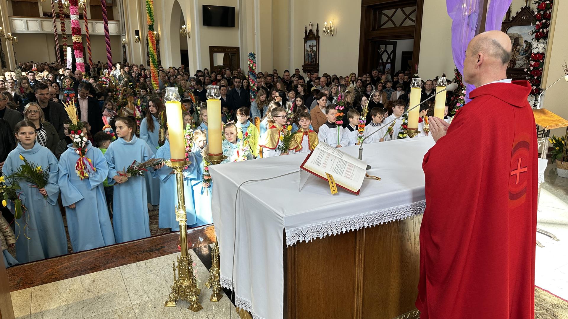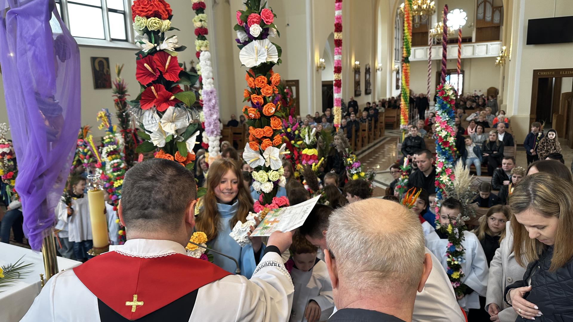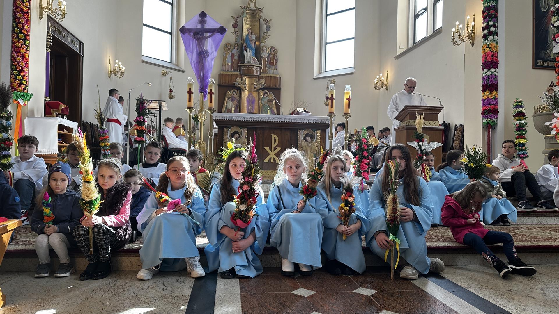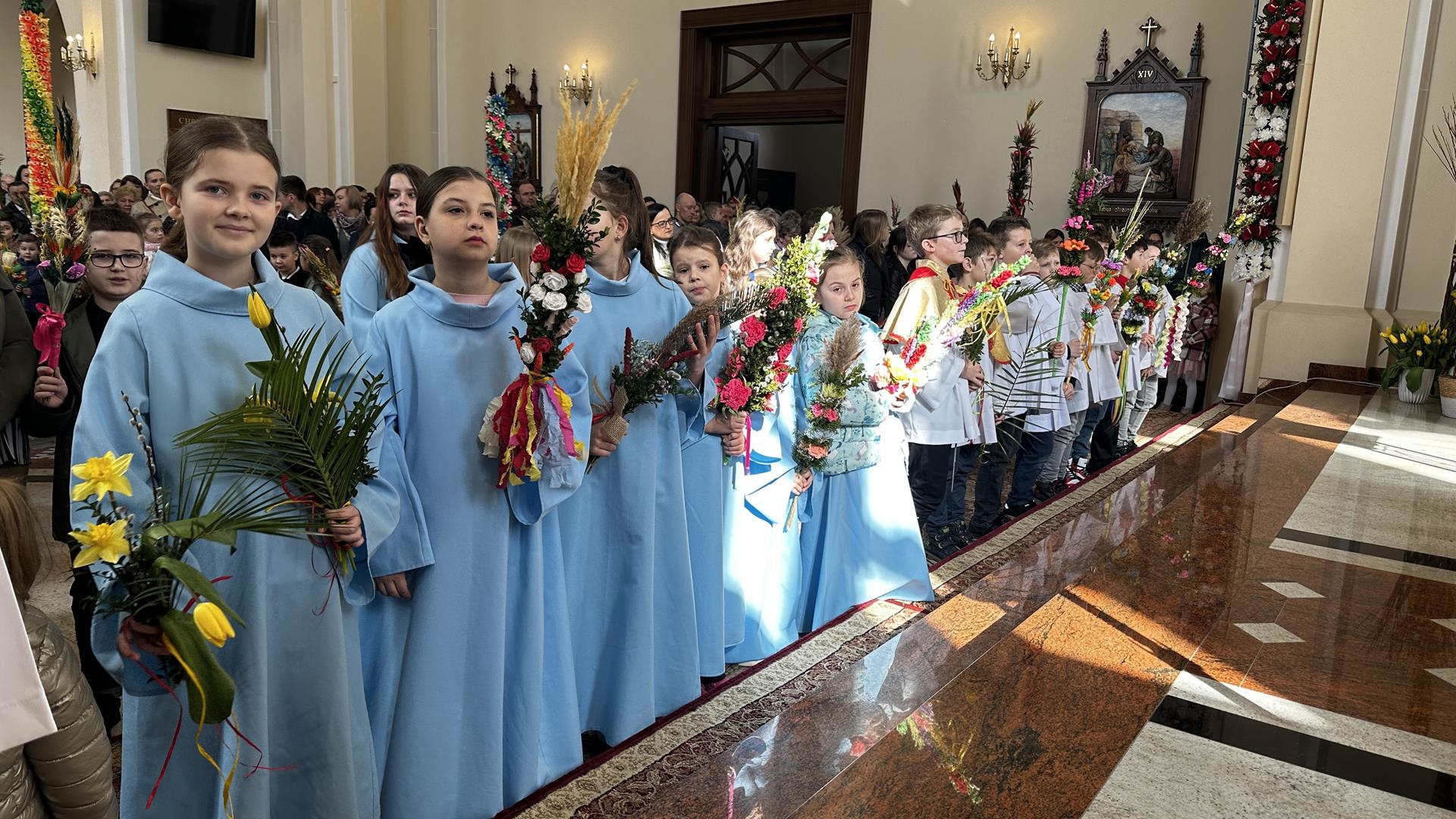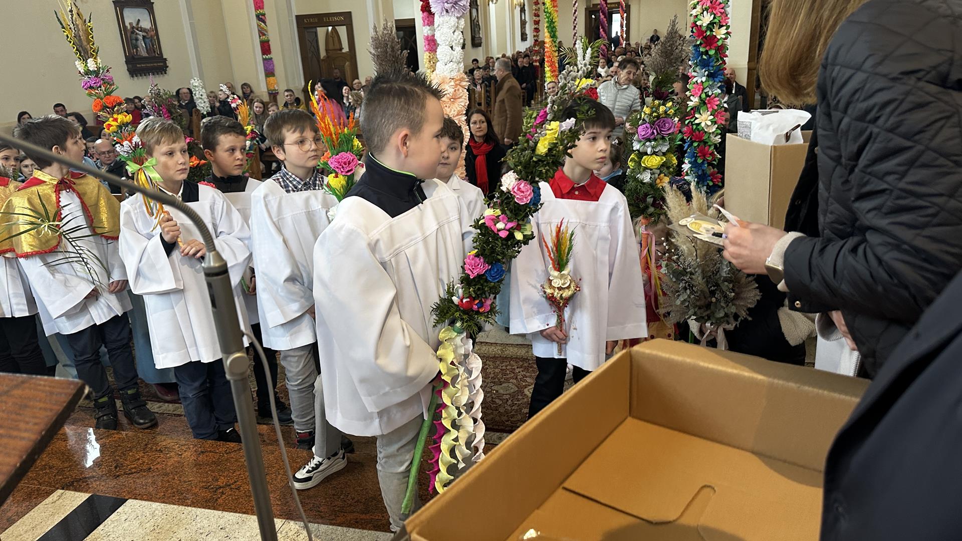 Niedziela Palmowa rozpoczyna w Kościele Wielki Tydzień. W czasie Mszy Świętej o godzinie 9:00 miał miejsce obrzęd poświęcenia palm. Po Eucharystii odbył się konkurs palm niskich do 3 metrów zorganizowany przez Akcję Katolicką. Pierwsze miejsce zajął Tymon Matuła, drugie miejsce zajęła Karolina Iwańska, a trzecie Nikodem Potok i Martyna Potok. Pierwsze cztery wyróżnienia otrzymali: Zofia Broda, Aleksandra Gryzło, Kamil Turek i Gabriela Zięba. W tym roku również jedenastu przedstawicieli grup parafialnych wykonało palmy wysokie 6 metrów: