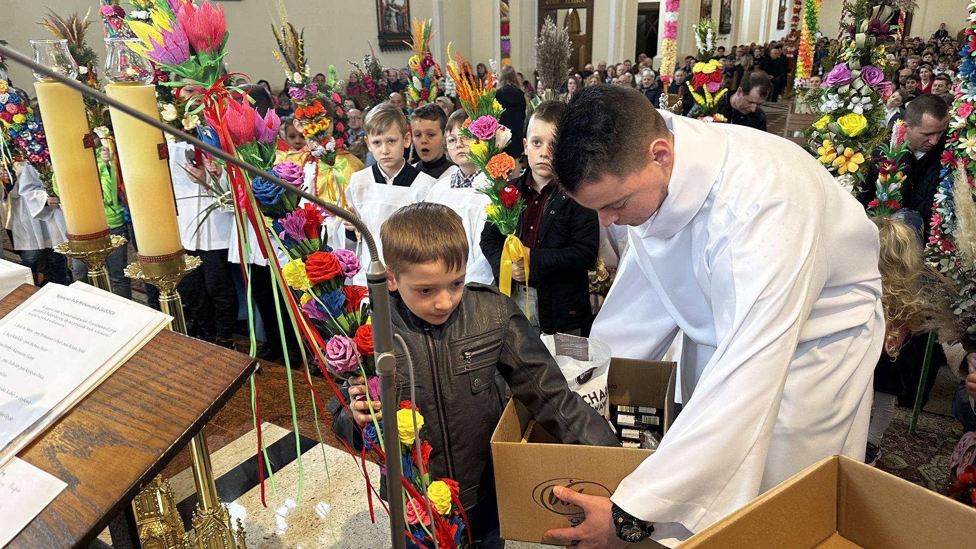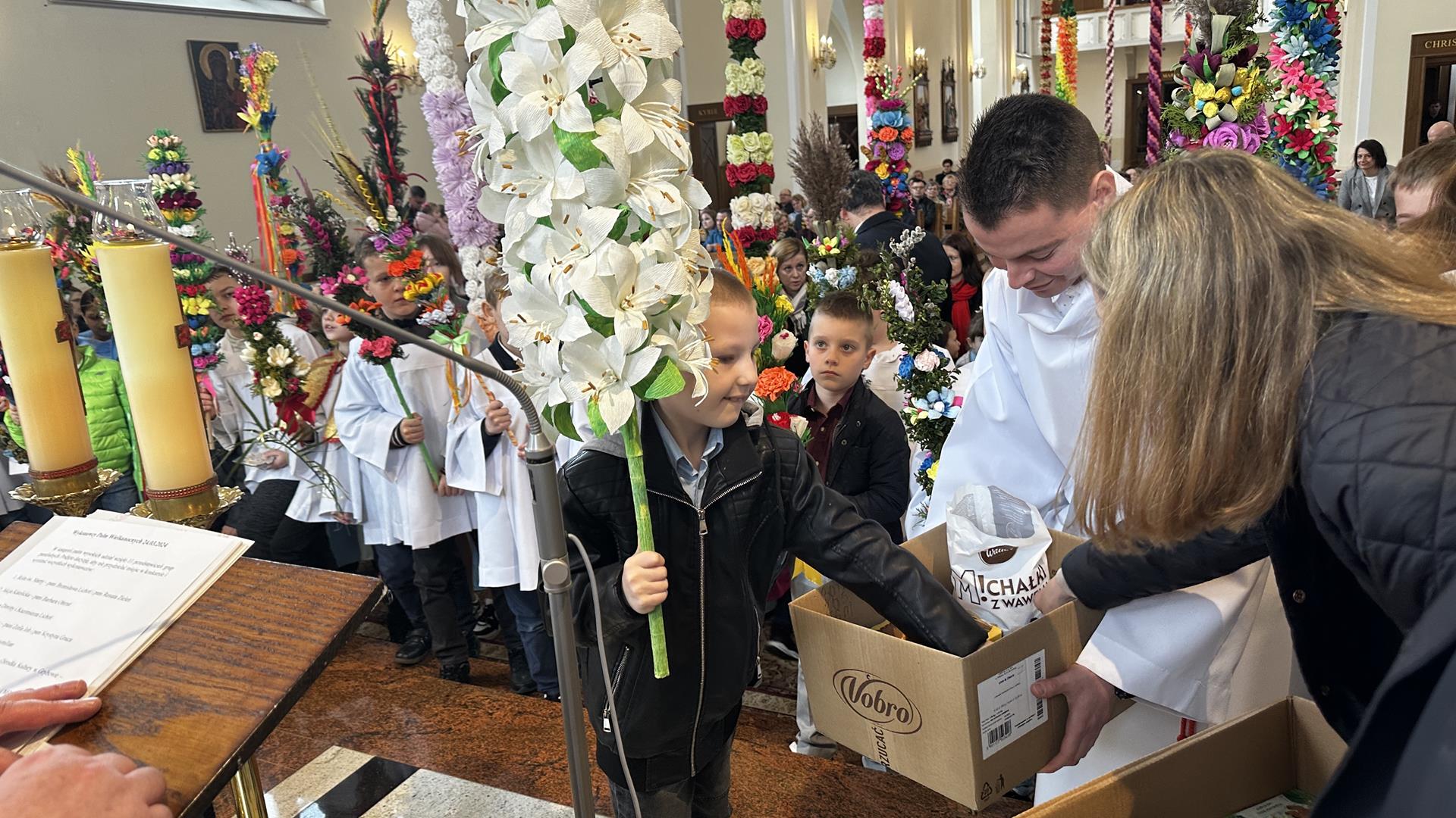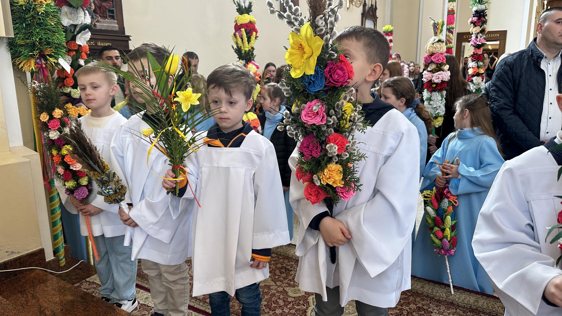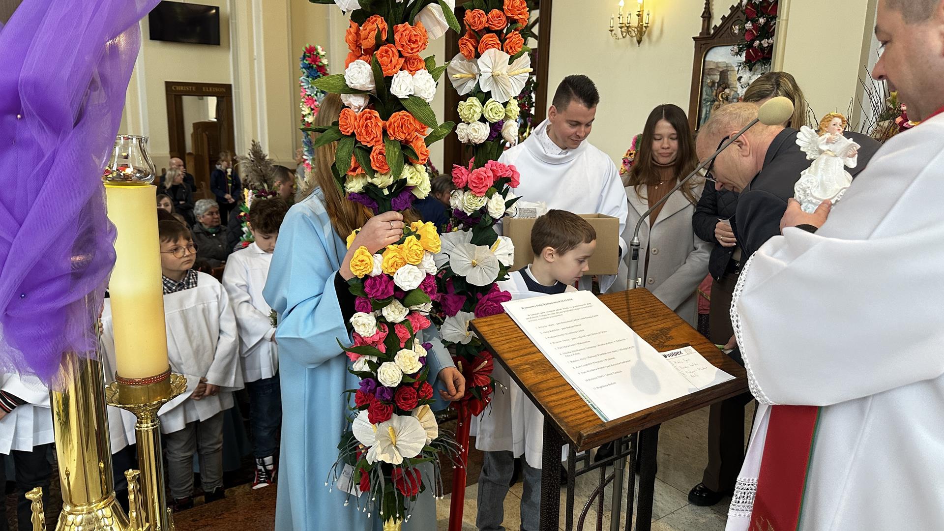 Niedziela Palmowa rozpoczyna w Kościele Wielki Tydzień. W czasie Mszy Świętej o godzinie 9:00 miał miejsce obrzęd poświęcenia palm. Po Eucharystii odbył się konkurs palm niskich do 3 metrów zorganizowany przez Akcję Katolicką. Pierwsze miejsce zajął Tymon Matuła, drugie miejsce zajęła Karolina Iwańska, a trzecie Nikodem Potok i Martyna Potok. Pierwsze cztery wyróżnienia otrzymali: Zofia Broda, Aleksandra Gryzło, Kamil Turek i Gabriela Zięba. W tym roku również jedenastu przedstawicieli grup parafialnych wykonało palmy wysokie 6 metrów: