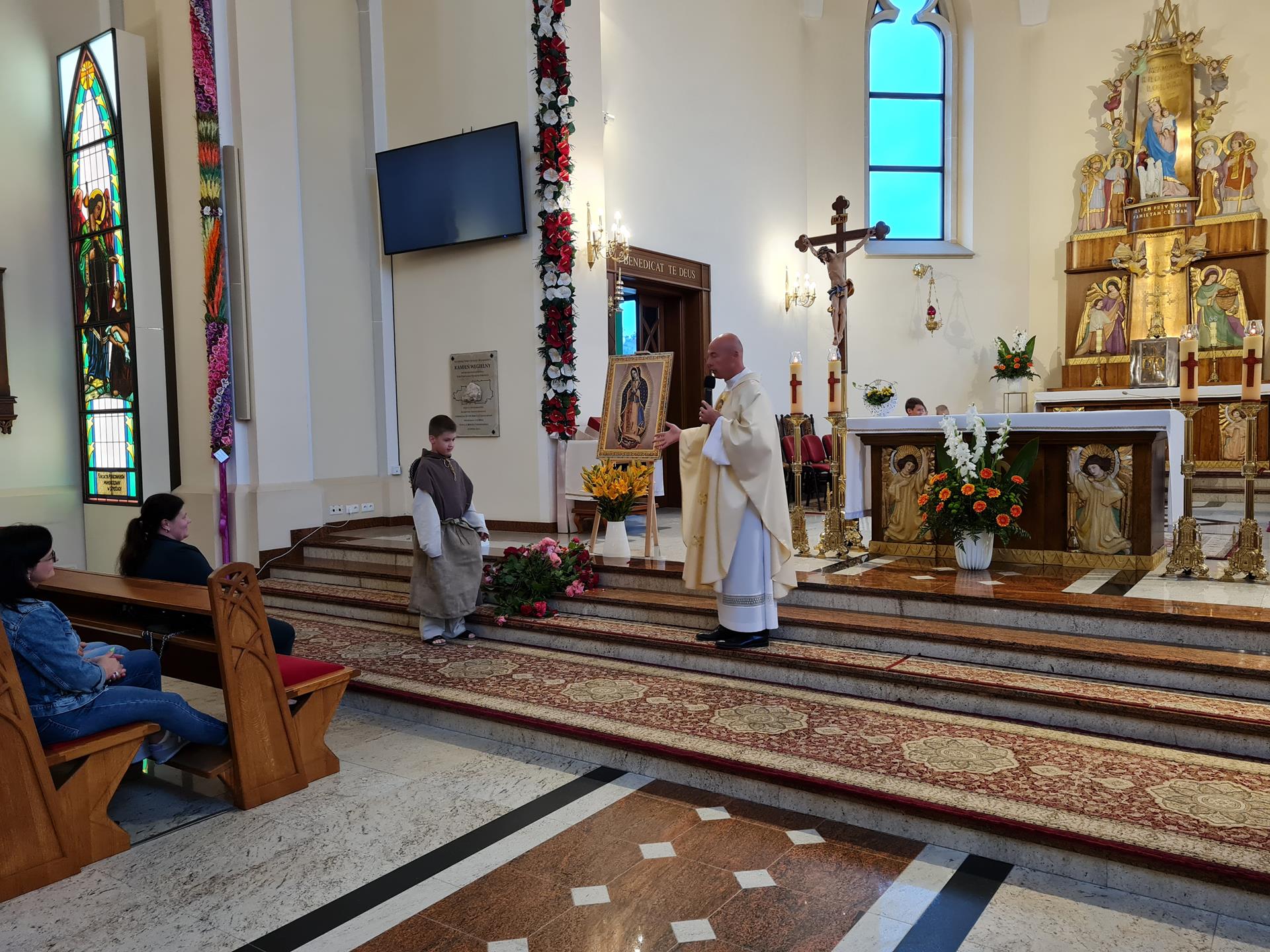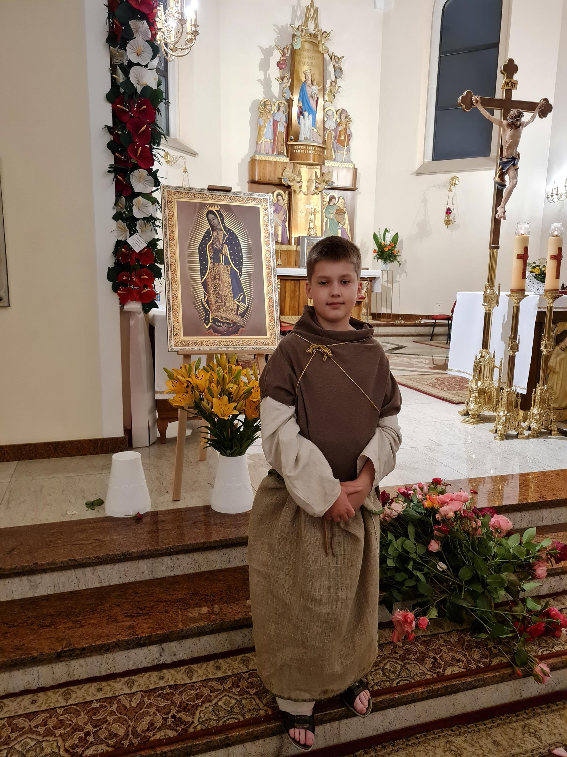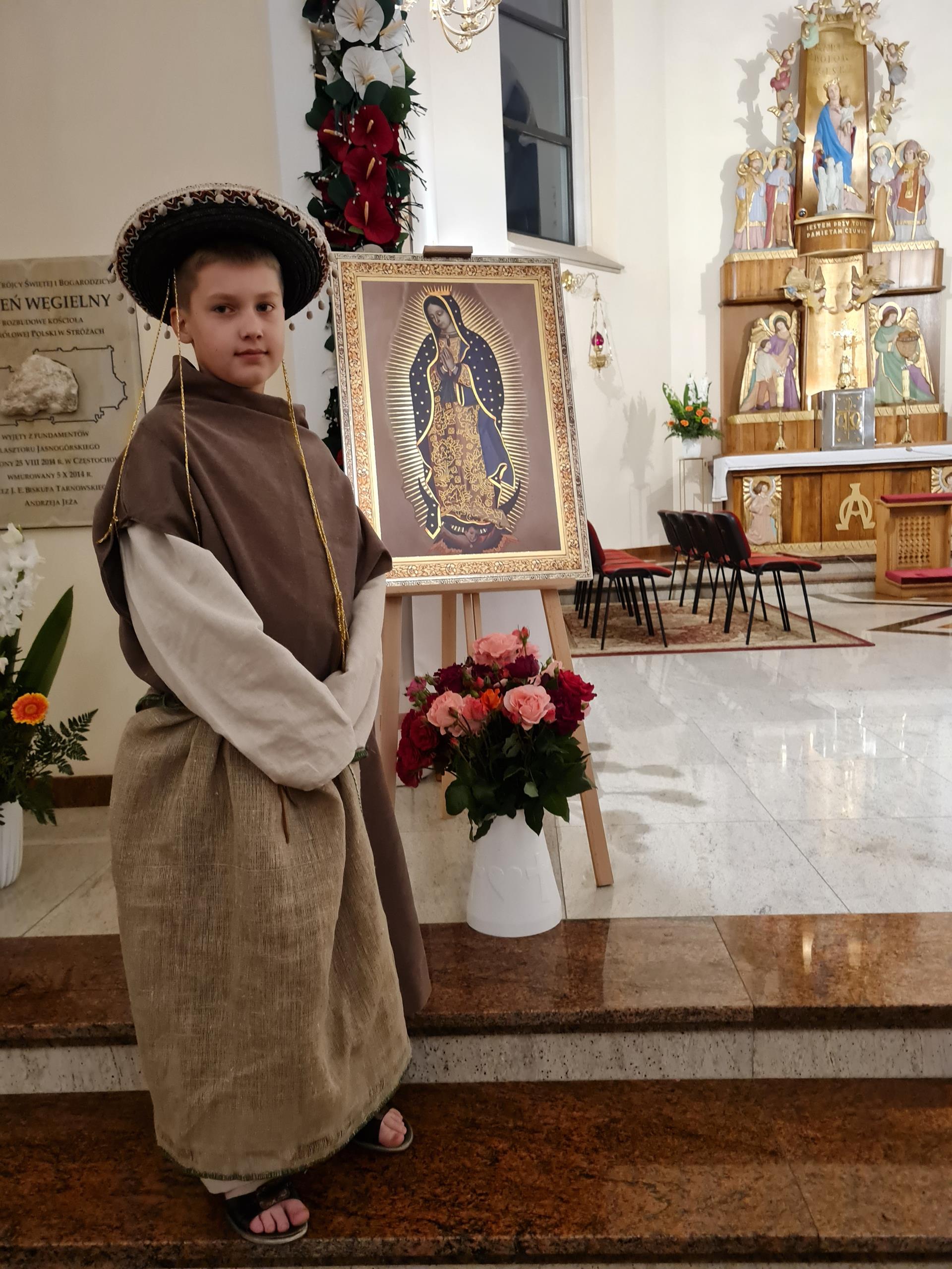W czasie pierwszosobotniego nabożeństwa różańcowego rozważaliśmy objawienia Matki Bożej w Guadalupe. Już tradycyjnie jedno z dzieci wcieliło się w postać Juana Diego, któremu Maryja przekazała swój cudowny wizerunek.