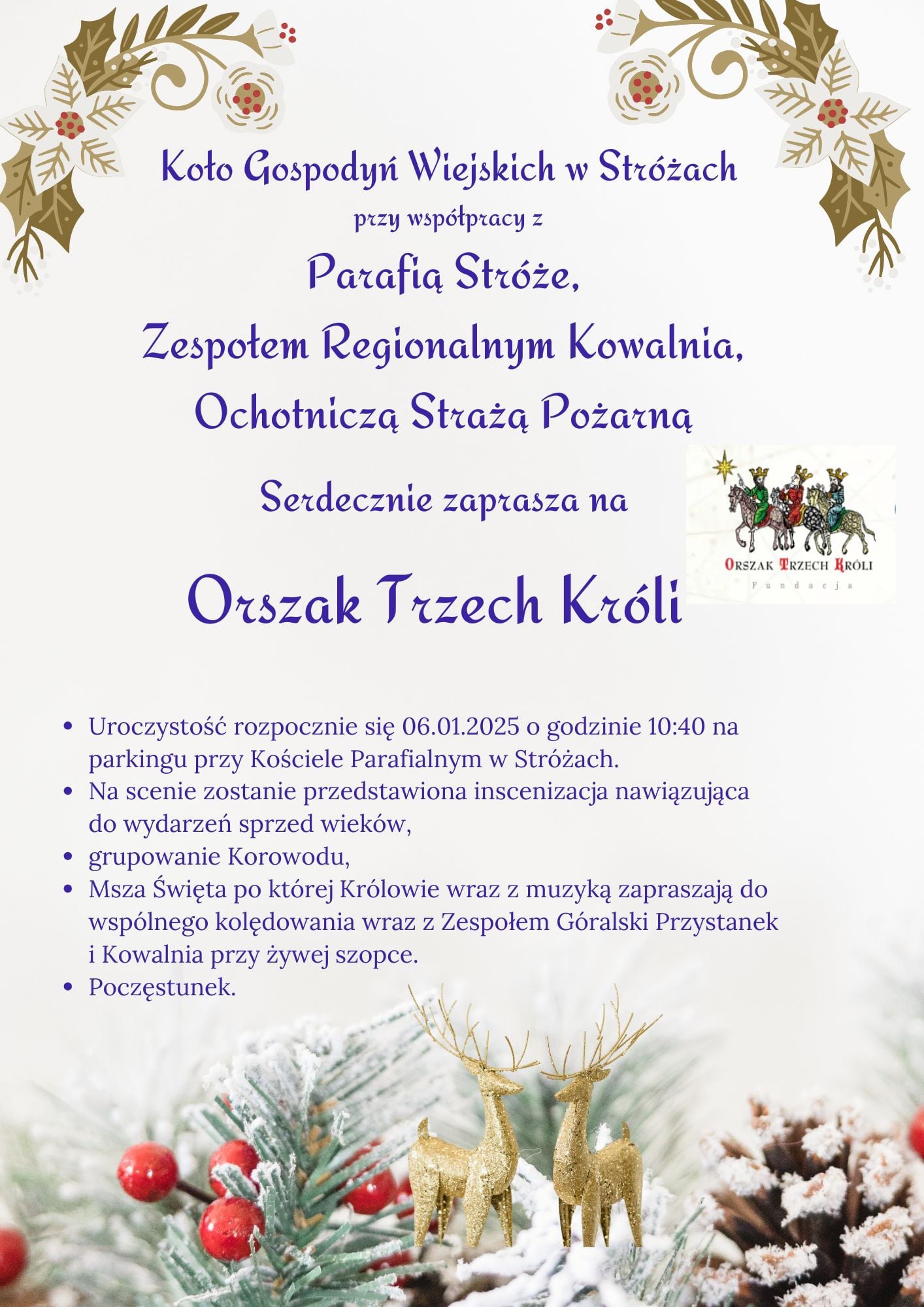 Koło Gospodyń Wiejskich w Stróżach przy współpracy z parafią Stróże, Zespołem Regionalnym Kowalnia oraz Ochotniczą Strażą Pożarną w Stróżach serdecznie zapraszają na ORSZAK TRZECH KRÓLI. Uroczystość rozpocznie się 06.01.2025 roku o godzinie 10.40 na parkingu przy kościele parafialnym. Na scenie zostanie przedstawiona inscenizacja nawiązująca do wydarzeń sprzed wieków. Nastepnie korowód za przewodem gwiazdy i Mędrców wyruszy do kościoła na Mszę Świętą. Po Eucharystii i złożeniu pokłonu przez Mędrców przy żywej szopce obok kościoła zapraszamy do wspólnego kolędowania wraz z zespołem Góralski Przystanek i Kowalnia oraz poczęstunek. W tym dniu nie będzie możliwości parkowania bezpośrednio przy kościele. Mamy nadzieję, że będzie to okazja do spotkania, śpiewu i radości z okazji tego wielkiego święta. Już nie możemy się doczekać tego spotkania!