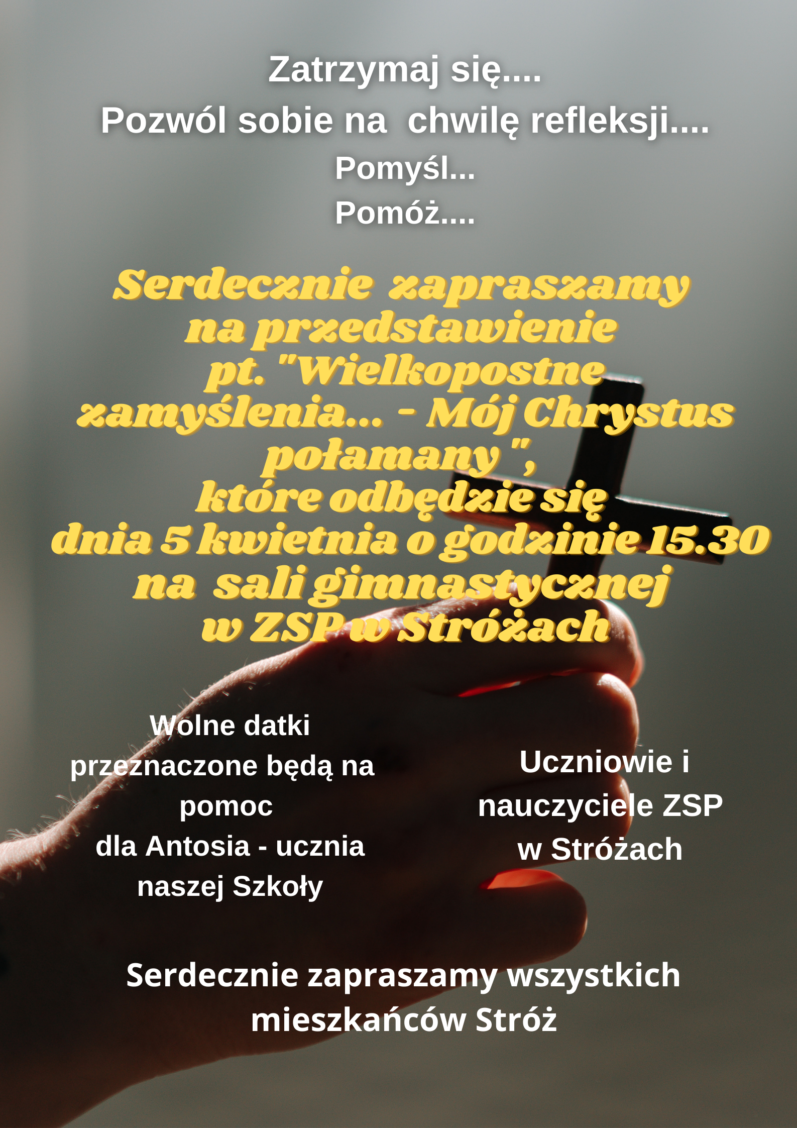 Uczniowie i nauczyciele ZSP w Stróżach serdecznie zapraszają na przedstawienie pt. "Wielkopostne zamyślenia... - Mój Chrystus połamany", które odbędzie się w Wielką Środę 5 kwietnia o godzinie 15.30 na sali gimnastycznej w ZSP w Stróżach. Zebrane wolne datki zostaną przeznaczone na pomoc dla Antosia - ucznia Zespołu Szkolno-Przedszkolnego w Stróżach.